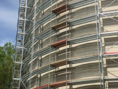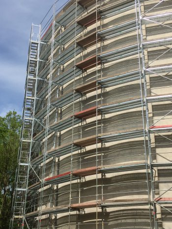 Arbeits- und Schutzgerüst für Fassadensanierung und Dachumdeckung.
